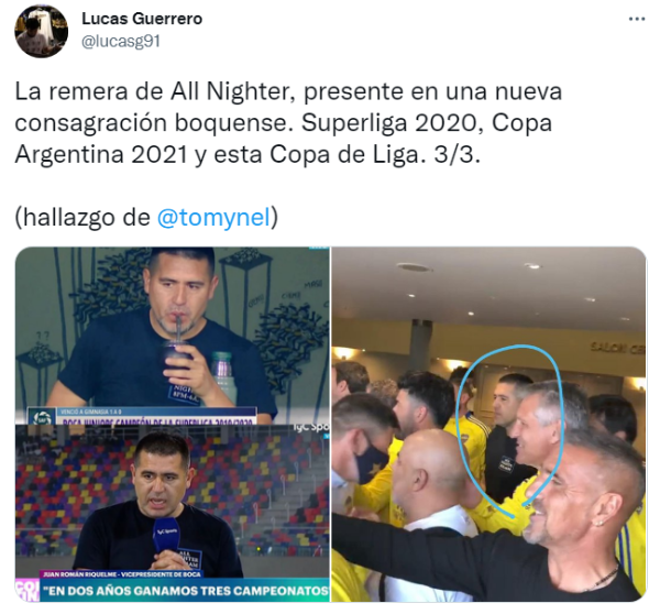 En redes sociales volvió a reflotarse una vieja teoría, que data de la última final de la Copa Argentina, y que aplica perfectamente a lo sucedido el fin de semana pasado en el Estadio Mario Alberto Kempes. En dicho duelo definitorio, también celebrado en Córdoba, Riquelme repitió vestimenta: remera negra, lisa, salvo por un detalle en el pecho. “All Nighter. 8PM-6AM”, dice el estampado. Aquella noche el Xeneize fue campeón.