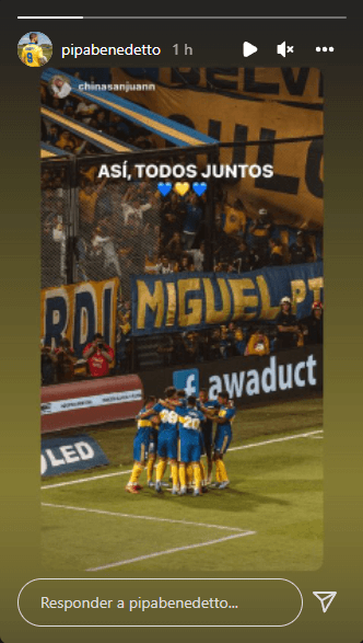 Reposteando en su Instagram una foto de “China” San Juan, una de las fotógrafas de Boca, el Pipa subió a su historia de la red social de la camarita un sentido abrazo con todo el plantel en el momento donde él convirtió el gol de penal junto a la frase “Así, todos juntos”.