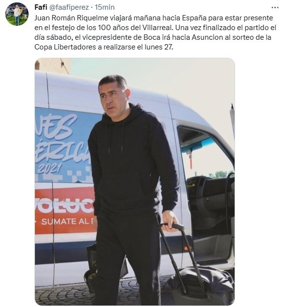 En ese contexto, el vice de Boca ya habría diagramado su agenda para el próximo fin de semana. “Juan Román Riquelme viajará mañana hacia España para estar presente en el festejo de los 100 años del Villarreal. Una vez finalizado el partido el día sábado, el vicepresidente de Boca irá hacia Asuncion al sorteo de la Copa Libertadores a realizarse el lunes 27”, informó el periodista Fafi Pérez a través de su cuenta de Twitter.
