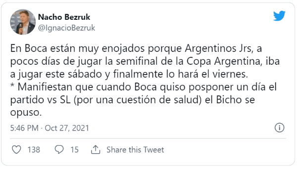 En Boca no solo molestó que el rival del miércoles tenga un día más de descanso, sino que le hayan permitido el cambio de fecha. En su momento, cuando el Xeneize pidió reprogramación de un día para no jugar con juveniles ante San Lorenzo (la Primera estaba aislada tras regresar de Brasil), Argentinos fue uno de los que se opuso. En su momento, el propio Juan Román Riquelme expuso públicamentea Tinelli.