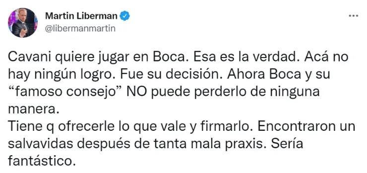 A pesar de la algarabía que poseen los hinchas, que están ansiosos porque se concrete la contratación estelar del ex Manchester United y PSG, apareció una fuertísima crítica para el Consejo de Fútbol, la cual estuvo apuntada, indirectamente, a Riquelme. “Cavani quiere jugar en Boca. Esa es la verdad. Acá no hay ningún logro. Fue su decisión. Ahora Boca y su “famoso consejo” NO puede perderlo de ninguna manera. Tiene que ofrecerle lo que vale y firmarlo. Encontraron un salvavidas después de tanta mala praxis. Sería fantástico”, enfatizó el periodista Martín Liberman en su cuenta de Twitter.