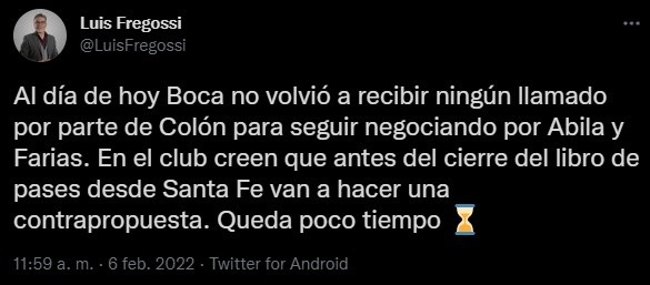 ¿En qué quedó esa idea? El periodista Luis Fregossi sostuvo este domingo en Twitter que ahora la estrategia del consejo de fútbol es esperar al próximo movimiento de Colón. “Al día de hoy Boca no volvió a recibir ningún llamado por parte de Colón para seguir negociando por Abila y Farias. En el club creen que antes del cierre del libro de pases desde Santa Fe van a hacer una contrapropuesta. Queda poco tiempo”, aseguró. ¿Habrá acuerdo?