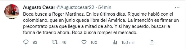 Luego, en horas del domingo, el periodista de ESPN Augusto César acercó detalles de las charlas por Martínez y hay un plan en marcha que podría darse en junio. “En los últimos días, Riquelme habló con el colombiano, que en junio queda libre del América. La intención es firmar un precontrato para que llegue a mitad de año. Y si hay acuerdo, buscar la forma de traerlo ahora. Boca busca romper el mercado”, sentenció. ¿Se dará el pase tan esperado por Román?