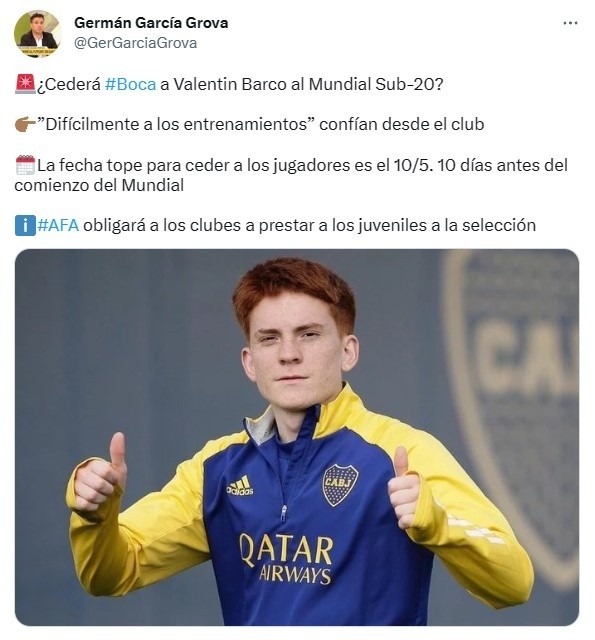 El periodista de TyC Sports, Germán García Grova, entregó detallesa través de sus redes sociales.“Difícilmente a los entrenamientos”, le habrían comentado desde el club tras recibir la noticia de que Barco deberá formar parte de la Albiceleste para el próximo Mundial sub-20 que se desarrollará entre el 20 de mayo al 11 de junio.