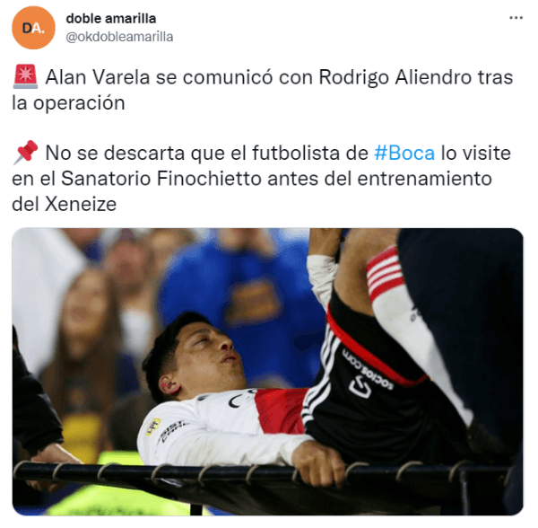 Luego de más de dos horas de operación, la cual fue exitosa, el mediocampista quedó internado en el Sanatorio Finochietto hasta nuevo aviso y estiman que no podrá volver a entrenarse a la par del grupo hasta 2023. Para sorpresa de algunos, Aliendro recibió un llamado mientras estaba en la clínica y llegó desde La Ribera.