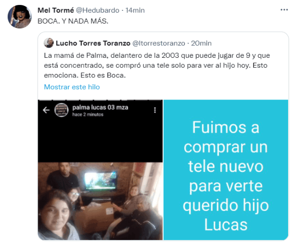 La madre del juvenil publicó en las historias de Whatsapp una foto de su familia posando junto a un televisor nuevo, recién sacado de la caja. La siguiente publicación explicó todo: “Fuimos a comprar un tele nuevo para verte, querido hijo Lucas”. Los seres queridos de Palma hicieron un esfuerzo y adquirieron una pantalla para ser testigos del momento más emocionante de la carrera deljugador. La historia se viralizó en redes sociales y conmovió a los hinchas, en una muestra de cariño como pocas por parte de una familia humilde en pos del sueño cumplido de su hijo.