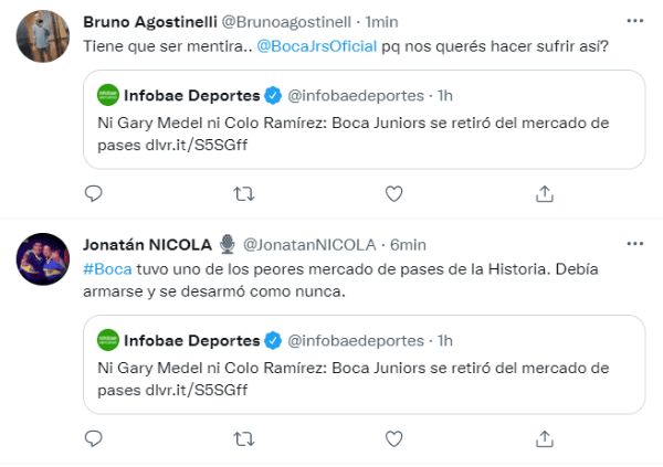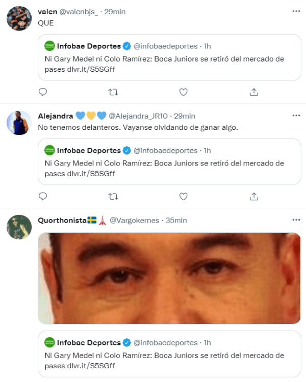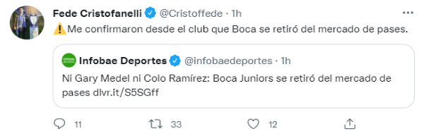 La noticia de la jornada estuvo a cargo de Infobae, quien informó que Boca se retiró definitivamente del mercado de pases y desistió de todas las negociaciones que estaban sin resolverse. Por este motivo, Miguel Ángel Russo tendrá que competir en la Copa Argentina y la Liga Profesional con lo que tiene a disposición, a la espera de que el próximo verano puedan llegar jugadores importantes si el Xeneize se clasifica a la Libertadores 2022.