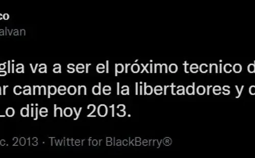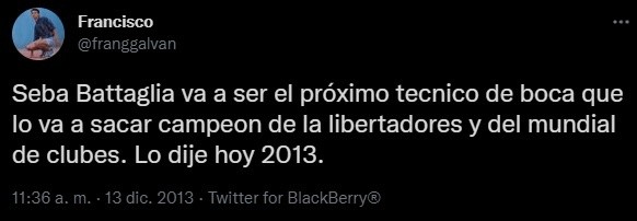 Francisco, cuyo usuario es @franggalvan, publicó el siguiente mensaje: “Seba Battaglia va a ser el próximo tecnico de Boca que lo va a sacar campeon de la Libertadores y del Mundial de Clubes. Lo dije hoy 2013”. Quizás él esperaba que el “León” asuma en su cargo poco después de ese tuit, pero lo cierto es que hubo que esperar ocho años.