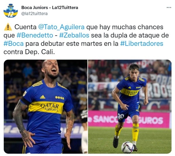 A partir de la información que brindó el periodista de TyC Sports, Leandro Aguilera, en la cabeza de Battaglia aparece la posibilidad de que Exequiel Zeballos sea el reemplazante de Sebastián Villa (suspendido por los disturbios ante Atlético Mineiro) y que acompañe a Darío Benedetto en el ataque.