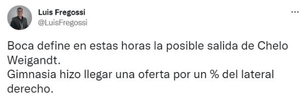 A pocas horas del cierre del mercado en la Liga, el periodista Luis Fregossi informó sorpresivamente que Marcelo Weigandt podría dejar el club y no por la vía del préstamo. “Boca define en estas horas la posible salida de ‘Chelo’ Weigandt. Gimnasia hizo llegar una oferta por un porcentajedel lateral derecho”, escribió el conductor deMundo Boca Radiopara informar acerca de la propuesta formal que le ha llegado al Consejo durante este jueves agitado.