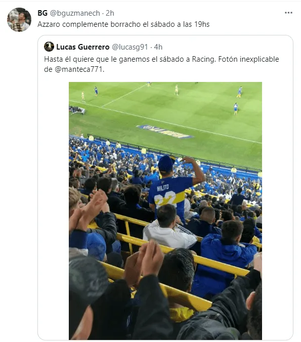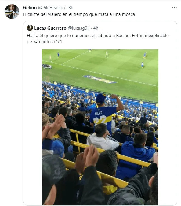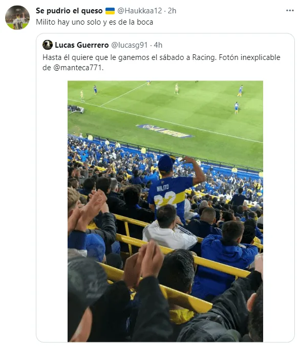 En medio de los festejos y la locura en La Bombonera, un hincha del Xeneize sacó el teléfono y tomó una fotografía insólita. Sí, aunque cueste comprender las razones, había una persona con la camiseta de Boca, el número 22 y el apellido “Milito”.