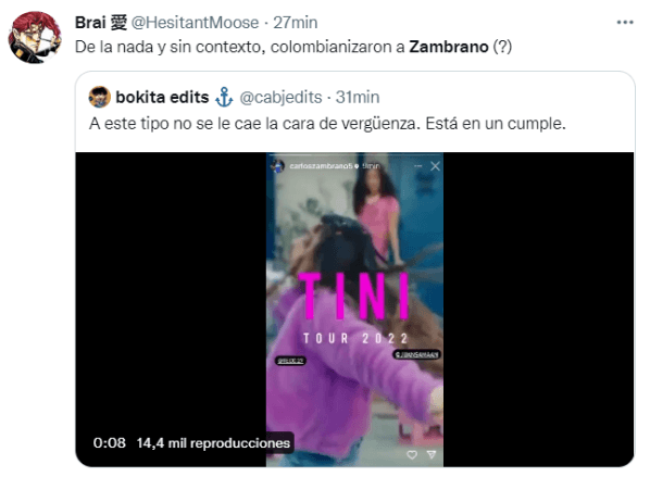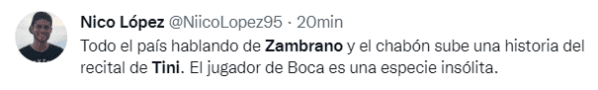 A menos de 24 horas, y señalado por los hinchas como una de las falencias del equipo, Zambrano sorprendió a todos en sus redes sociales con un llamativo video en donde promociona un recital de Tini Stoessel a llevarse a cabo este lunes. La repercusión fue negativa en Twitter por parte de los fanáticos de Boca.