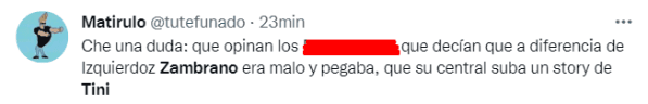 “Está en un cumple” o “sin contexto”, fueron algunos de los comentarios que aparecieron en Twitter luego de la storie de Zambrano en Instagram. El jugador volvió a ser titular tras la sanción que recibió por el pleito con Darío Benedetto y no parece haber cumplido las expectativas de los hinchas en su regreso.