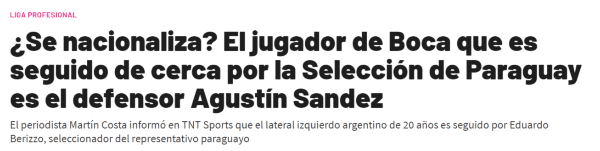 Se trata de Agustín Sández, quien es estudiado hace tiempo por Eduardo Berizzo para sumarse a la Selección de Paraguay para próximas convocatorias. En abril, el periodista Martín Costa había contado en TNT Sports el lateral izquierdo argentino estaba en carpeta para el combinado guaraní, pero para ello debía nacionalizarse paraguayo.