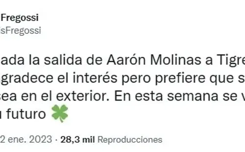 El periodista Luis Fregossi avisó que, pese a los avances producidos por los clubes, el enganche tiene otras preferencias con el próximo equipo en su carrera profesional. “Está frenada la salida de Aarón Molinas a Tigre.El volante agradece el interés pero prefiere que su destino sea en el exterior”, escribió vía Twitter. Un mensaje claro para el CdF.