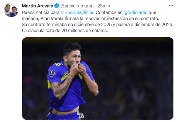 Luego, con el correr de la tarde, el periodista Martín Arévalo -junto a otros colegas- anunció que el club de La Ribera llegó a un acuerdo con Alan Varela para renovar su contrato hasta diciembre de 2026, extendiendo la relación con el jugador por una temporada más a diferencia del vínculo que se había firmado anteriormente. Además, habrá un aumento salarial para el volante central indiscutido en el equipo de Hugo Ibarra.