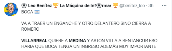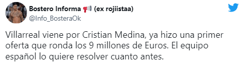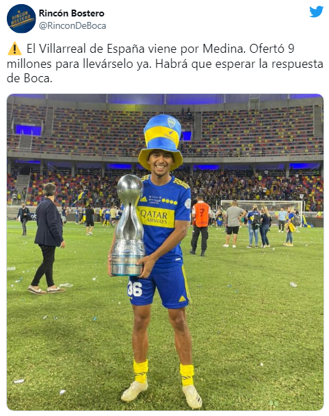 Medios partidarios de Boca aseguraron que el Villarreal aterrizó fuerte en Argentina para desembolsar alrededor de 9 millones de dólares por Cristian Medina. El volante encontró minutos de juego durante el último “Torneo de Verano 2022” que conquistó el conjunto de Battaglia y el Submarino Amarillo podría hacer su último esfuerzo económico del mercado invernal para asegurarse a una de las joyas del Xeneize. En caso de cerrar la venta, el Consejo de Fútbol tendrá un verdadero dineral para adquirir una nueva estrella en el plantel para competir en esta temporada.