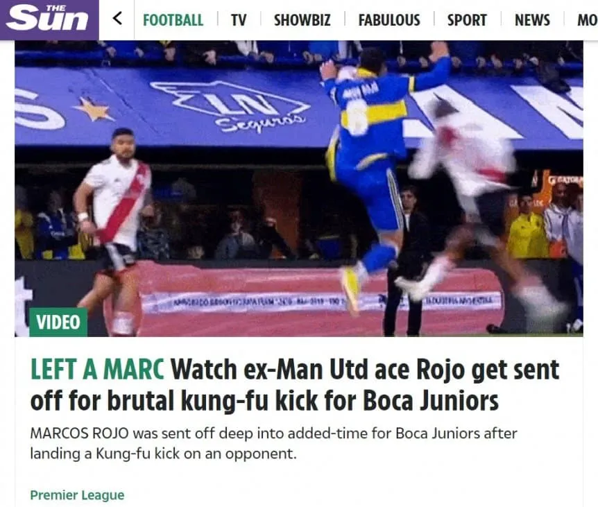 Replicando lo que sucedió con el ex jugador del Manchester United durante varias temporadas, el prestigioso The Sun de Inglaterra se hizo eco de la jugada: “Mira cómo la ex estrella del Manchester United, Marcos Rojo, es expulsada por una brutal patada de kung-fu en el clásico de Boca Juniors con River Plate“, titularon.
