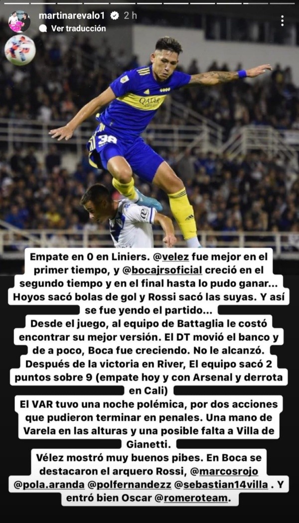 ¿Qué dijo Martín Arévalo al respecto? Por ahora, el cronista eligió el silencio sobre el tema. Pero publicó una historia en Instagram en la que analizó el partido del sábado: “Empate cero a cero en Liniers. Vélez fue mejor en el primer tiempo y Boca creció en el segundo. Y en el final, hasta lo pudo ganar. Hoyos sacó bolas de gol y Rossi sacó las suyas. Y así se fue yendo el partido”.