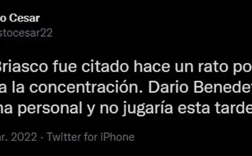 De la nada, una mala noticia para Boca en este domingo: todo indica que Darío Benedetto no jugará el partido ante Huracán, desde las 19:15. El goleador se fue de la concentración y Sebastián Battaglia tuvo que llamar a Norberto Briasco, quien no estaba citado. Si bien no se confirmó, todo hace pensar que el “Pipa” no estará.