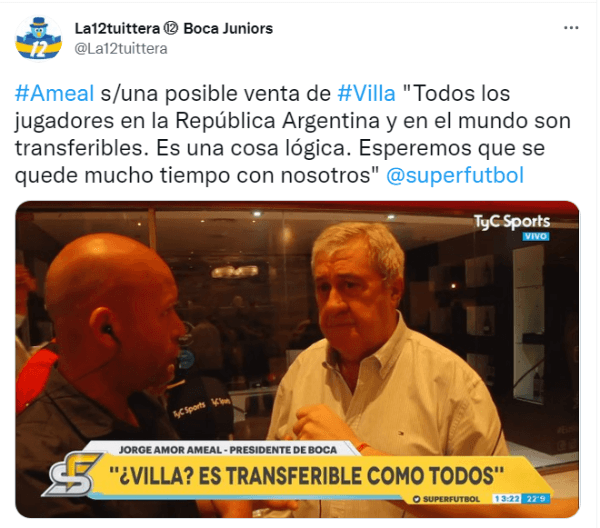 A continuación, al mandatario se le preguntó sobre el futuro del colombiano en el club a pocos meses de la apertura del mercado de pases y Ameal sorprendió con sus declaraciones. “Todos los jugadores en la República Argentina y en el mundo son transferibles. Esta es una cosa lógica. Esperemos que se quede mucho tiempo con nosotros”, cerró. ¿Qué hará Villa ante una nueva oferta desde el exterior?