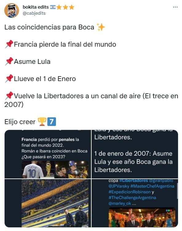Sin embargo, algún que otro fanático está apelando a la “mística” que porta la camiseta azul y oro en el certamen más importante del continente y el usuario @cabjedits en Twitter decidió hacer un repaso de las serias coincidencias que tiene el 2007, año de la última consagración de Boca en al Libertadores, con el año que acaba de comenzar.