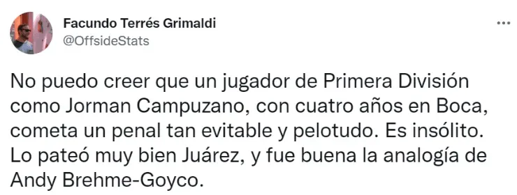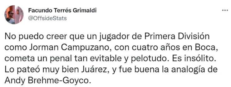 En Twitter, y después del penal que le cometió a Juan Ignacio Nardoni, rápidamente se hizo tendencia el nombre de Jorman Campuzano. Y los hinchas mostraron muchísima disconformidad con la actuación que tuvo el mediocampista colombiano que no jugaba desde la final de la Copa LPF frente a Tigre, donde ingresó para disputar los últimos 3 minutos.