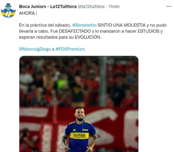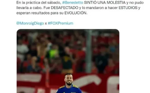 Durante la previa del choque entre el Xeneize y el Globo, el periodista Diego Monroig alarmó a todos los fanáticos.“En la práctica del sábado, Benedetto sintió una molestia y no pudo llevarla a cabo. Fue desafectado y lo mandaron a hacerse estudios, y esperan resultados para su evolución”, afirmó en la transmisión.