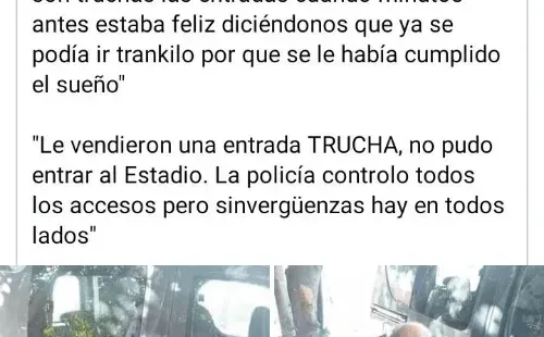 El hecho se hizo viral luego de que Flavia, su hija, hiciera un descargo en Facebook: “No saben la impotencia que tengo. Ver llorar a mi padre por la vergüenza que pasó cuando la policía le dijo que no puede entrar porque las entradas son truchas, cuando minutos antes nos estaba feliz diciendo que ya se podía ir tranquilo porque había cumplido su sueño. Sinvergüenzas hay en todos lados”.