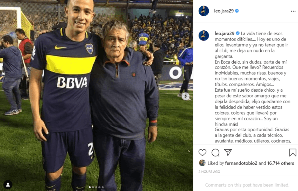 Una muy emotiva carta escribió Leonardo Jara para publicar en su cuenta oficial de Instagram. El defensor es uno de los tantos jugadores que se fueron de Boca en este mercado de pases, buscando el Consejo de Fútbol y Miguel Ángel Russo una clara renovación en el plantel, de cara a los octavos de final de la Copa Libertadores ante Atlético Mineiro.