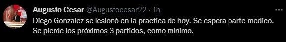 El periodista Augusto César lo contó en Twitter: “Diego Gonzalez se lesionó en la practica de hoy. Se espera parte medico. Se pierde los próximos 3 partidos, como mínimo”. Trascendió que al “Pulpo” le harán estudios para saber la gravedad de la lesión. No viajará a Córdoba para el encuentro de esta semana.
