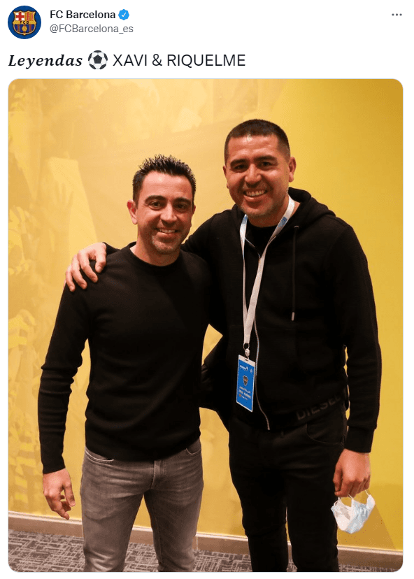 “Leyendas”, tituló la cuenta oficial del Barcelona en Twitter para compartir la foto que se tomaron los dos exfutbolistas que han compartido vestuario en la institución catalana. Román solo vistió la camiseta blaugrana en la temporada 2002-23 y fue compañero de Xavi antes de marcharse al Villarreal, club que idolatra a Riquelme debido a su enorme aporte desde 2003 hasta 2007. Tras el paso del “Torero” por España, JR10 se consagró con la Copa Libertadores 2007 portando la camiseta del Xeneize.