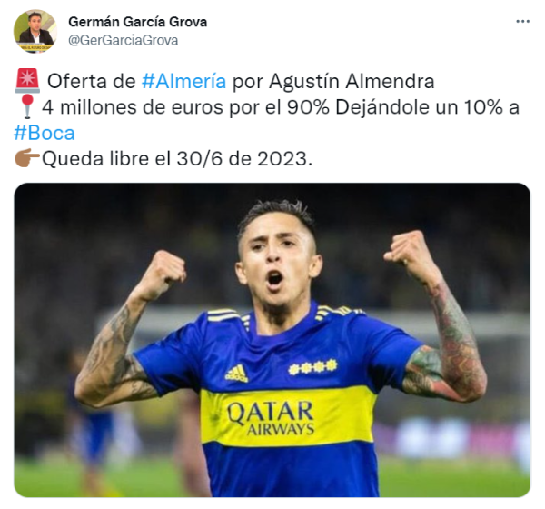 La oferta ronda los 4 millones de euros por el 90% del pase del mediocampista, por lo que a Boca le quedaría el 10% restante para beneficiarse de una futura venta. La propuesta, a priori, parece favorable para todas las partes: el Xeneize no lo tendrá en cuenta para jugar en Primera, el jugador quiere irse y el dinero supera las expectativas planteadas en La Ribera. De no mediar inconvenientes, Almendria partiría hacia Europa en este mercado.