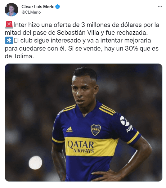 Según Luis César Merlo, el conjunto dirigido por Alexander Medina “hizo una oferta de 3 millones de dólares” por el jugador. La misma fue rechazada ya que Boca pretende más dinero sabiendo que el 30% del pase del jugador le pertenece aún a Deportes Tolima. ¿Qué pasará?por la mitad del pase de Sebastián Villa y fue rechazada.