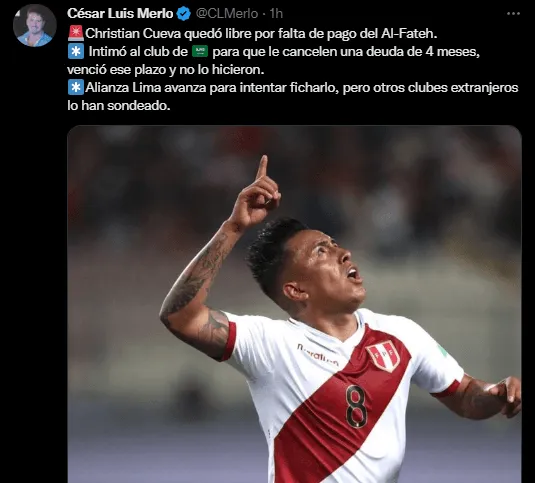 ¿Qué pasó? Según informó el periodista César Merlo, “Christian Cueva quedó libre por falta de pago del Al-Fateh“. Incluso, el jornalista afirmó que el talentoso volante peruano “intimó al club de para que le cancelen una deuda de 4 meses, venció ese plazo y no lo hicieron“, y por eso decidió rescindir su vínculo. Ahora, con el pase en su poder, se conoció queAlianza Lima lo pretende pero también fueron varios los clubes sudamericanos que quieren contar con él.