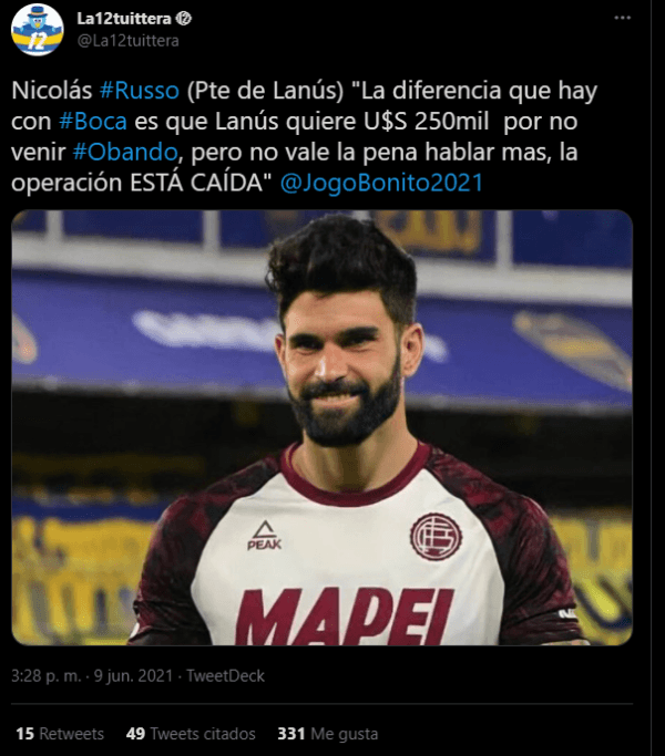 También declaró que la diferencia extra que quería ante la negativa de Obando era de 250.000 dólares pero que por la demora en la respuesta de Boca de esa contraoferta, ya no valía la pena la negociación. Aunque también aclaró que la relación con el club Xeneize sigue siendo excelente, pero que no por eso no iba a defender los intereses de Lanús.