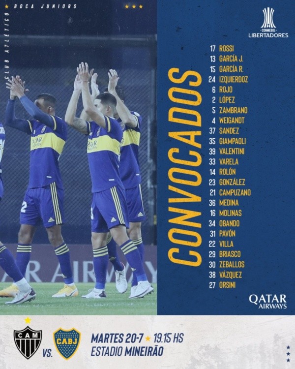 Luego del último entrenamiento antes de partir, Miguel Ángel Russo dio la lista de convocados sin muchas sopresas:Rossi, Javier García, Ramiro García, Izquierdoz, Rojo, Zambrano, López, Weigandt, Sandez, Giampaoli,Valentini, Varela, Rolón, González, Campuzano, Medina, Molinas, Obando, Pavón, Villa, Briasco, Zeballos, Orsini y Vázquez.