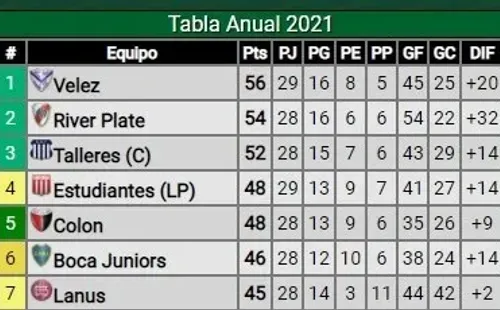 Vélez lidera esa tabla y lo siguen River y Talleres, pero un cupo se liberará con el campeón de la Liga Profesional de Fútbol. Colón está quinto pero ya clasificó por ganar la Copa de la Liga. Si este sábado le gana a Huracán, el equipo de Battaglia superará al “Sabalero” y al “Pincha” y dará un paso importante en busca de asegurar su lugar en la Copa 2022.