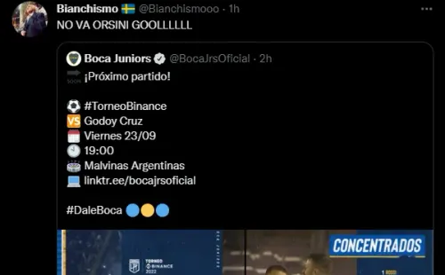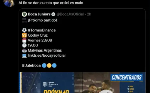 Y por su flojo rendimiento general y en los últimos encuentros disputados, los hinchas de Boca celebraron en redes su baja. Esto también va de la mano a que el pasado martes, el día post empate ante Huracán donde Orsini disputó quince minutos, fue duramente resistido en redes por los fanáticos xeneizes, algo que nuevamente se repitió al confirmarse su ausencia para el duelo con el Bodeguero.