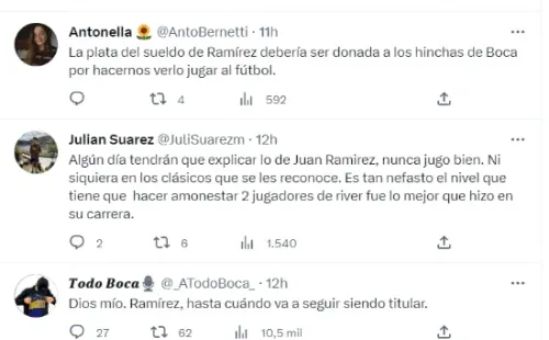 “Ya no sé ni qué decir de Ramírez”, escribió un hincha en su cuenta de Twitter. “La plata del sueldo de Ramírez debería ser donada a los hinchas de Boca por hacernos verlo jugar al fútbol”, soltó una usuaria. “¿Hasta cuándo va a seguir siendo titular?”, arremetió otro. “Su nivel es nefasto”, tiró un hincha. Deberá levantar…