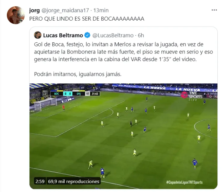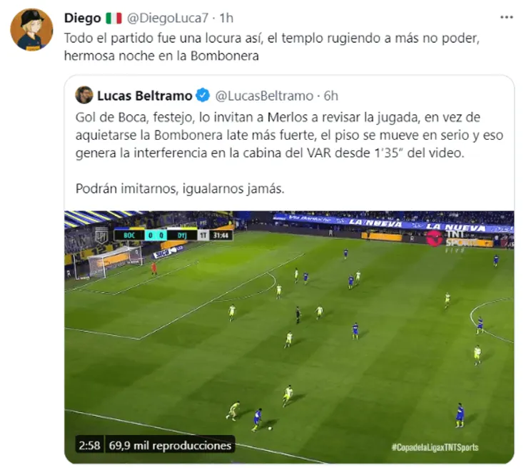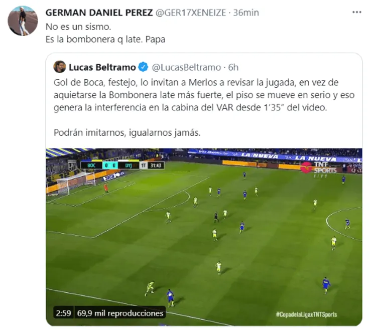 Según contó en su Twitter Lucas Beltramo, periodista de TyC Sports y confeso hincha de Boca, después del gol y en plena revisión del VAR “la Bombonera late más fuerte, el piso se mueve en serio y eso genera la interferencia en la cabina del VAR”.Será creer o reventar, pero las imágenes de la transmisión no dejan dudas…