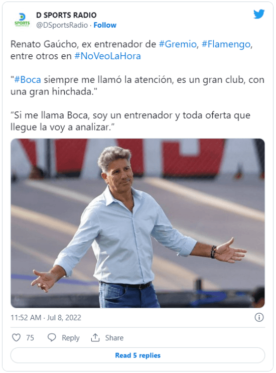 Se trata de Renato Portaluppi, campeón de la Copa Libertadores 2017 con Gremio y subcampeón en 2021. El brasilero fue instalado como posible DT del club de la Ribera y a los hinchas les encantó la idea. En diálogo con DIRECTV, el propio entrenador habló del tema: “Boca siempre me llamó la atención, es un gran club, con una gran hinchada”.