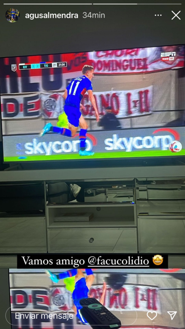 Minutos después de la eliminación del equipo de Marcelo Gallardo, Agustín Almendra compartió una historia en su cuenta de Instagram dedicada a Facundo Colidio, autor del segundo gol de Tigre. Pero no fue el único futbolista del Xeneize que se movió en las redes tras la caída de River.