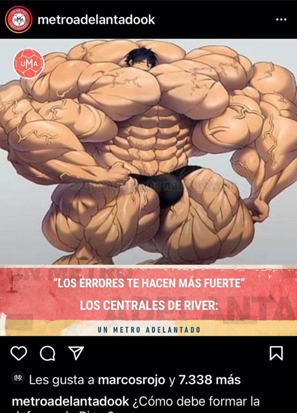 “Los errores te hacen más fuerte“, era la frase disparadora de la gastada para el plantel del Millonario. “Los centrales de River”, expone el meme, con una foto de un dibujo animado de una persona con muchísimos músculos, dando a entender la mala noche que tuvo la última línea del equipo de Gallardo. Y a Rojo lo divirtió.