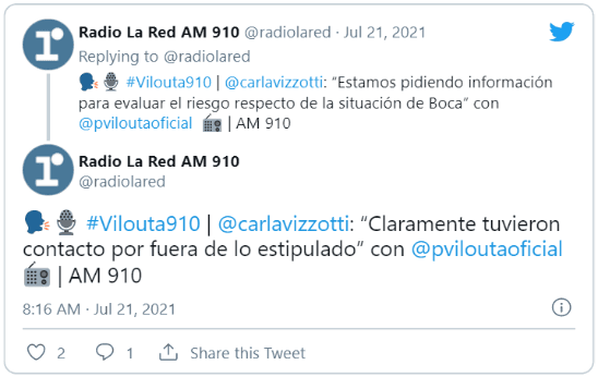 “Estamos en contacto con el ministro de Turismo y Deporte, Matías Lammens, y con el Jefe de Gabinete, Santiago Cafiero,para pedir información a las autoridades sanitarias para evaluar el riesgo”, expresó Carla Vizzotti, ministra de Salud, en Radio La Red.