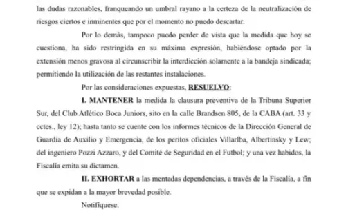 “Resuelvo mantener la medida de la clausura preventiva de la Tribuna Superior Sur del Club Atlético Boca Juniors hasta tanto se cuente con los informes técnicos de la Dirección General de Guardia de Auxilia y Emergencia, de los peritos oficiales de Villarlba, Albertinksy y Lew; del ingeniero Pozzi Azzaro, y del Comité de Seguridad en el Fútbol; y una vez habidos, la Fiscalía emita su dictamen”, expresó el juez a través de una notificación oficial.