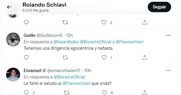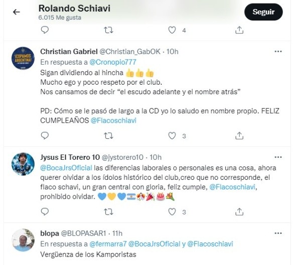 “Vergüenza”, “mucho ego y poco respeto por el club”, “tenemos una dirigencia egocéntrica y nefasta”, decían algunos contundentes tuits en donde los hinchas expresaban su bronca por la falta del saludo del Xeneize a una leyenda de la institución. Lejos de quedarse al margen, Schiavi se manifestó en acuerdo con las opiniones marcando el famoso “like” en la red social del pajarito azul.