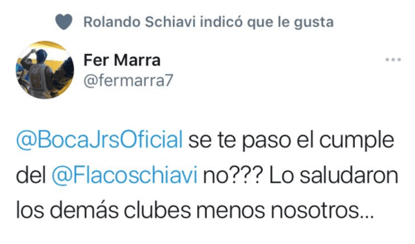 Contrario a como se esperaba, el Xeneize no redactó siquiera un texto para saludar a Schiavi por su cumpleaños y la omisión del club de La Ribera fue motivo de enojo para varios hinchas, los cuales se manifestaron en Twitter por ello. Entre tantos mensajes de felicitaciones, el exdefensor le dio “me gusta” a varias publicaciones que tenían como foco una fuerte crítica a la actual dirigencia de Bocay, con esto, quedó clara la postura del “Flaco”.