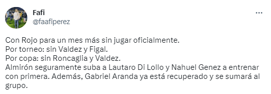 Es por eso que, como medida de urgencia, el DT de Boca estudia promover a dos juveniles para las próximas prácticas. “Almirón seguramente suba a Lautaro Di Lollo y Nahuel Genez a entrenar con Primera”, informó el periodista Fafi Pérez a través de su cuenta de Twitter.