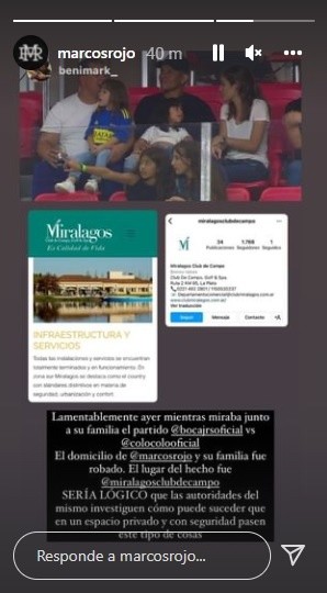 En las historias, Marcos Rojo compartió una publicación en la que se eleva una denuncia por lo sucedido en la noche del lunes. “Lamentablemente ayer, mientras miraba junto a su familia el partido de Boca contra Colo Colo, el domicilio de Marcos Rojo fue robado”, señaló la cuenta @benimark_, y el defensor replicó el mensaje.